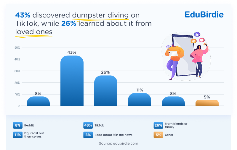 More than a quarter (26%) of young people were introduced to dumpster diving by loved ones, while 11% figured it out for themselves. However, most (43%) discovered the trend on TikTok – with #DumpsterDiving videos showing lucrative scores, from smartphones to snacks, and makeup to money, grabbing their attention.