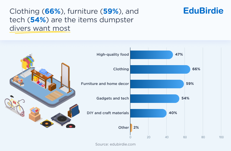 Clothing (66%), furniture and home decor (59%), and tech and gadgets (54%) are top of the dumpster diving wishlist. However, high-quality food (47%) and DIY and craft suppliers (40%) make for tempting trash, too.