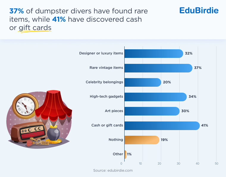 However, it isn’t all make-believe. Not every dumpster will pay the bills, but many do genuinely contain hidden gems. Some 81% say they’ve found rare items, with some of the most common things found in dumpsters including cash and gift cards (41%), vintage goods (37%), and high-tech gadgets (34%).